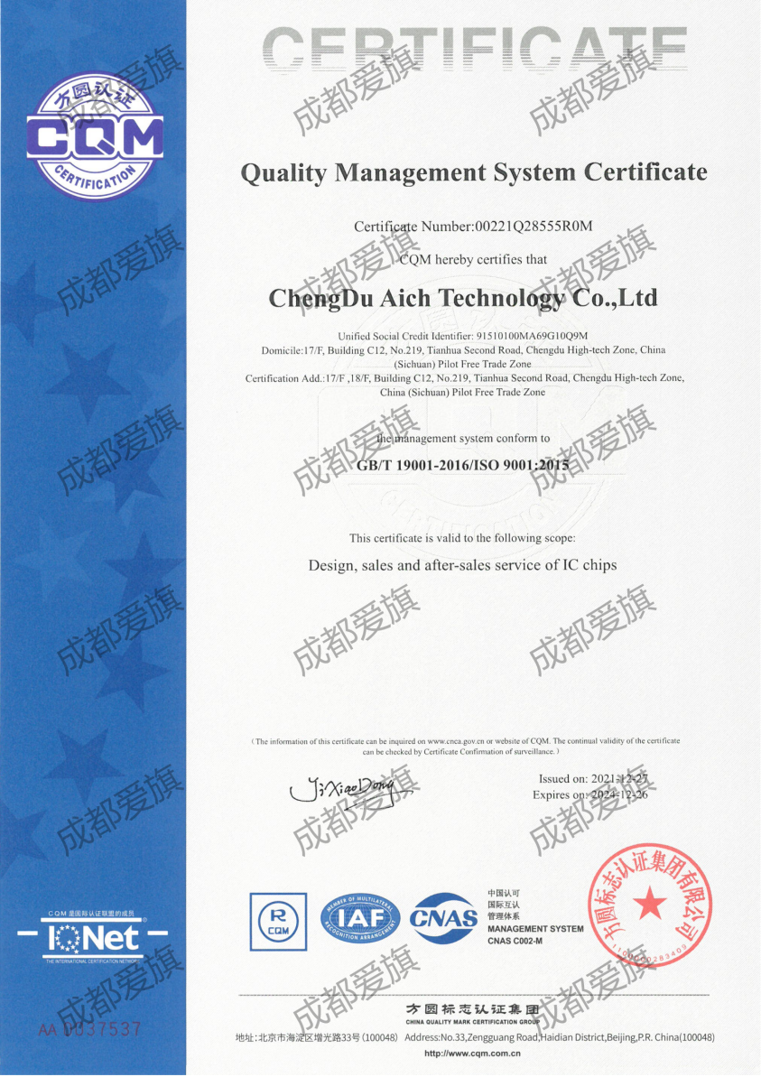 經(jīng)過(guò)一系列嚴格審核,愛旗通過(guò)ISO9001質量管理體系認證,于2021年12月27日獲得GB/T 19001-2016/ISO 9001:2015質量管理體系認證證書。這(zhè)一喜訊證實愛旗已建立了符合ISO 9001:2015認證标準的質量管理體系,并能(néng)夠持續良好(hǎo)的運行,公司具有提供滿足顧客要求和适用法規要求的産品和服務的能(néng)力。